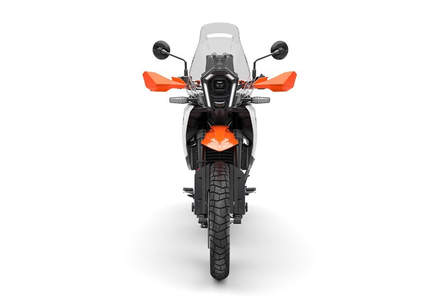You'll no doubt hit some highways at some stage. Good thing, then, that the KTM 390 ADVENTURE range boasts a sturdy and efficient windshield. Thanks to its slim profile, the rider isn't obstructed when moving around the machine. It also offers an unobstructed view directly in front of the bike - even when covered in dirt.
