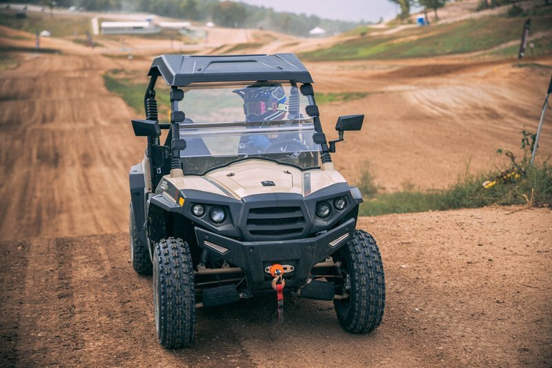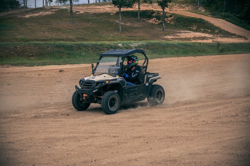 The Strike 250 is the ultimate sport side-by-side giving youth riders their first chance to drive. With built in parental safety features, the Strike 250 is powered by a 4-stroke single cylinder OHC engine with an automatic CVT transmission and independent dual a-arm suspension. Outfitted with accessories the Strike 250 comes standard with a roof, windshield, doors and a 2,500 lb synthetic rope winch.